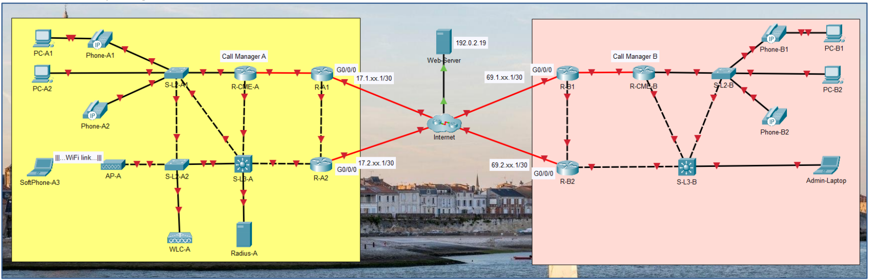 Lors de ce projet, il fallait concevoir des réseaux informatiques sur deux sites distants (modélisés sous Cisco Packet Tracer), les sécuriser, implémenter une politique de qualité de service ainsi que des services réseaux et les relier à l’aide d’un VPN IPSec. Les réseaux devaient disposer de services DHCP, VoIP, Wi-Fi WPA2 Entreprise et avoir des accès en SSH aux équipements intermédiaires.